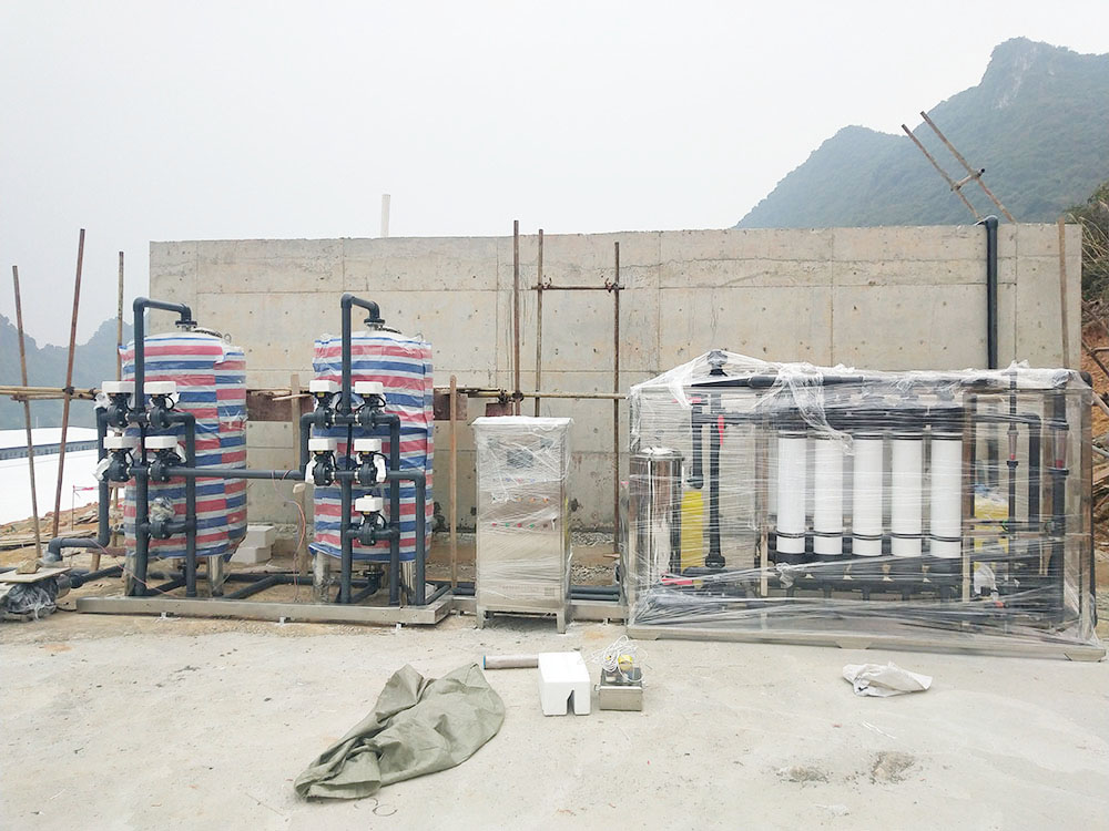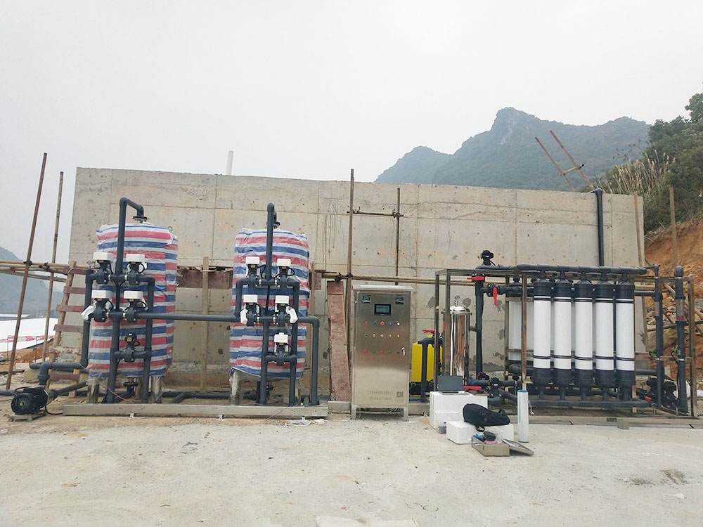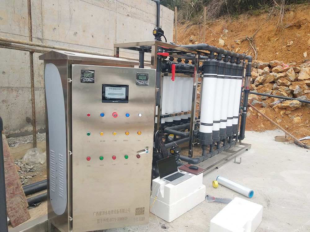 本方案主要針對原水為河水,以河水為飲用水源的地區,常常在雨季會遇到水質渾濁發黃問題。河水通常比較渾濁,水面漂浮臟東西、樹葉、水藻等,尤其在暴雨季節,水中泥沙量增加,雜質多,濁度、色度、氣味、細菌含量超標,因此必須使用專業凈水設備處理后才能達到生活飲用的目的。我們對河水的凈化主要是除去水中雜質,包括以下幾種:泥沙、大分子顆粒雜質、懸浮物、藻類、膠體,去除污染色度、異味、微生物、細菌、病毒等,有的源水會含有HCO、Ca 、SO 、Cl 、Na 、Mg 和K。為了將河水指標達到生活用水標準,通過康津超濾設備進而得到凈化??到蛩幚頌楦鶕嶋H用途情況制定以下解決方案。用水人數大約在200至300人,用水處理量每小時約10-12噸。
