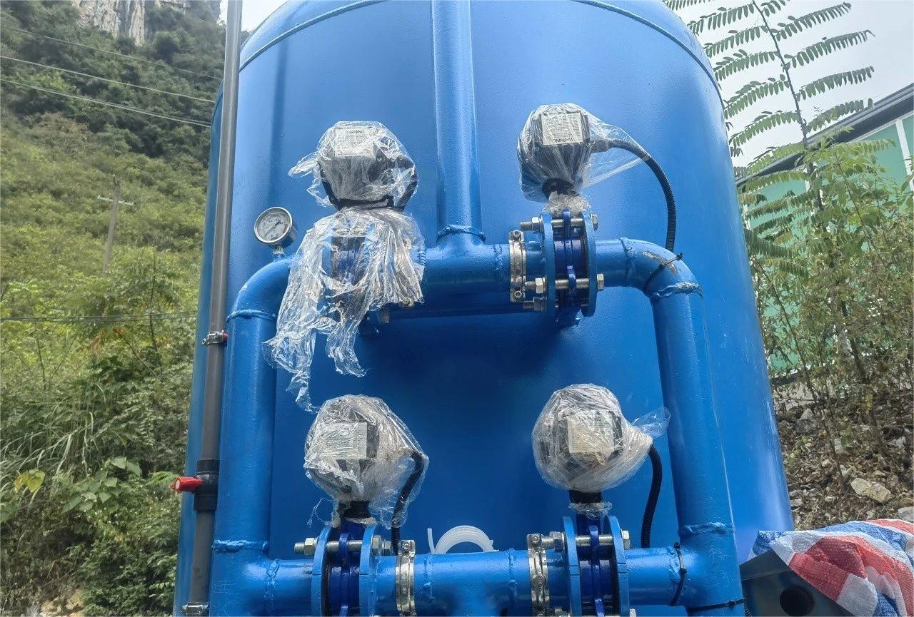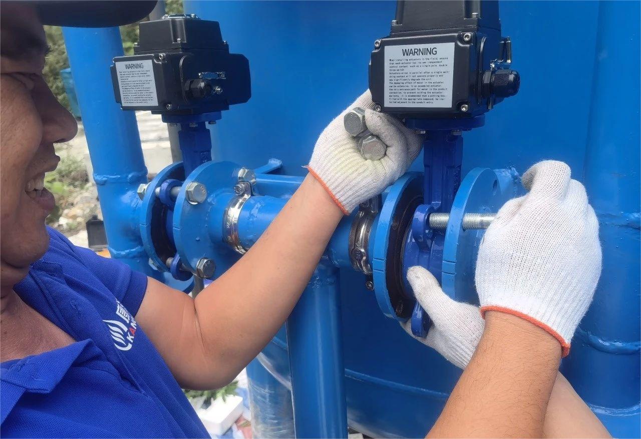 因為場地的原因,我們的設備安裝前需要進行準確定位才可以能進行下一步,將電動閥進行安裝和加固,本次的過濾罐共裝了5個電動閥,我們設備的電動閥采用的是自動的閥門,具有自動沖洗的功能,可根據(jù)業(yè)主的情況具體設置正洗和反洗的時間和次數(shù)。