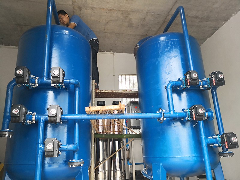 本方案主要針對原水為河水、地下水、自來水等地區,水源通常比較渾濁,水面漂浮臟東西、樹葉、水藻等,尤其在暴雨季節,水中泥沙量增加,雜質多等情況。因此利用填料來降低水中 濁度,截留除去水中懸浮物、有機物膠質顆粒,是給水凈化的重要水處理設備。康津水處理為根據實際用途情況制定以下解決方案。用水處理量每小時約10噸。
