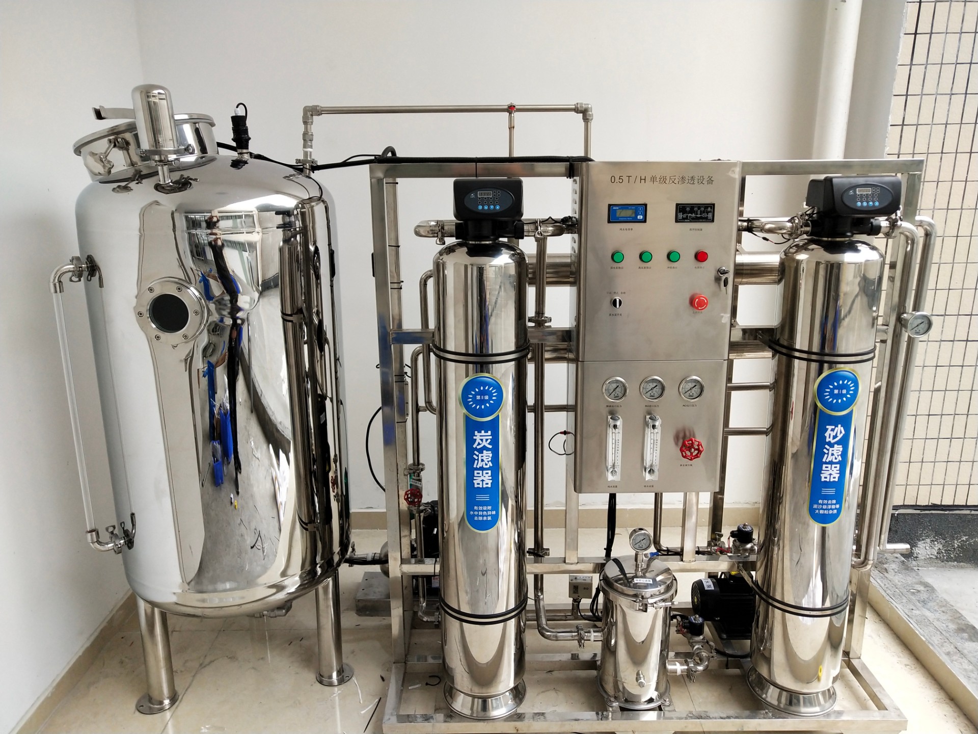 反滲透(RO)系統(tǒng)利用反向自然滲透原理,去除水中的絕大部分溶解鹽類同時去除一些大分子和預處理未去除的小顆粒等。反滲透系統(tǒng)包括1臺5m保安過濾器、1臺高壓泵、1套RO膜組、1套阻垢劑投加設備和1套RO清洗設備。RO膜組布置在一個不銹鋼機架上。成套設備本體上有各種閥門和各種顯示儀表,便于用戶現(xiàn)場維護和監(jiān)控。RO系統(tǒng)水回收率在75%以上,系統(tǒng)一年內(nèi)脫鹽率不小于98%。